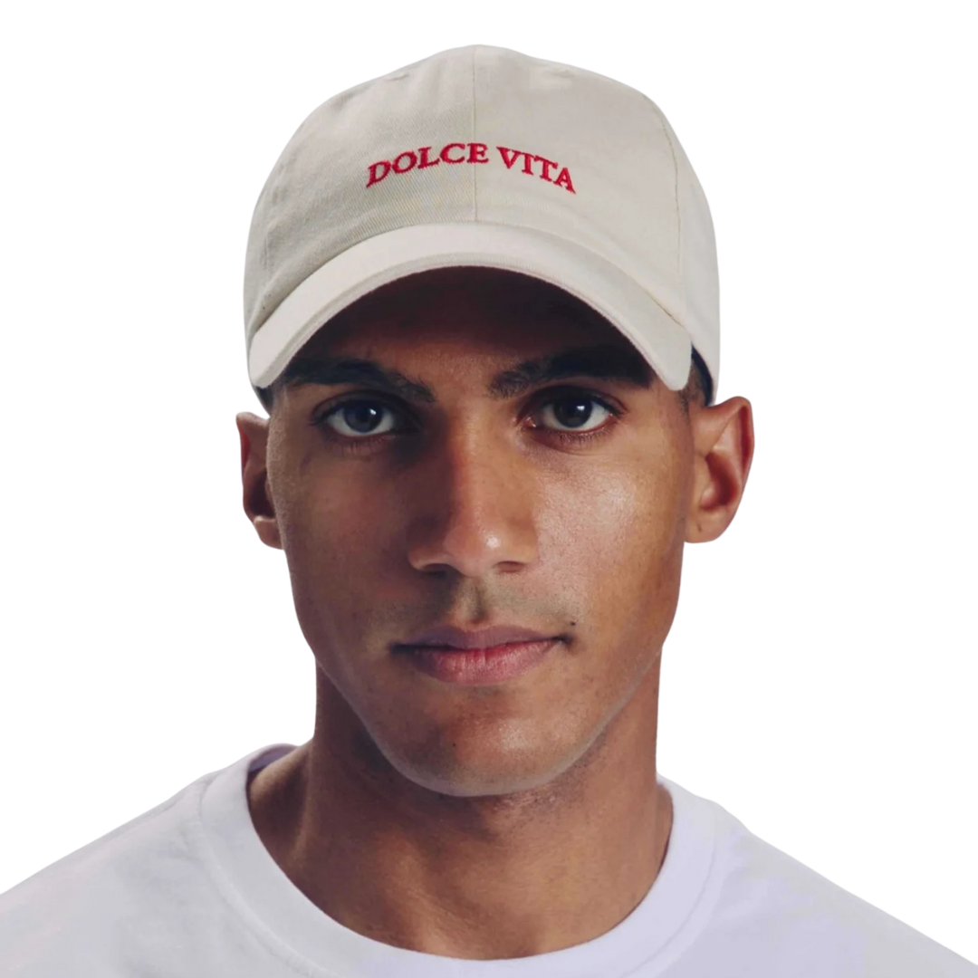 Italienisches Lebensgefühl auf 100 % Baumwolle. Beige mit rotem Stick. Sommerlich, leicht und voller Genuss – wie ein perfekter Tag in Rom.